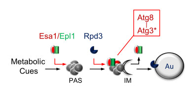 图为乙酰化酶Esa1和去乙酰化酶Rpd3调控自噬发生的模型。